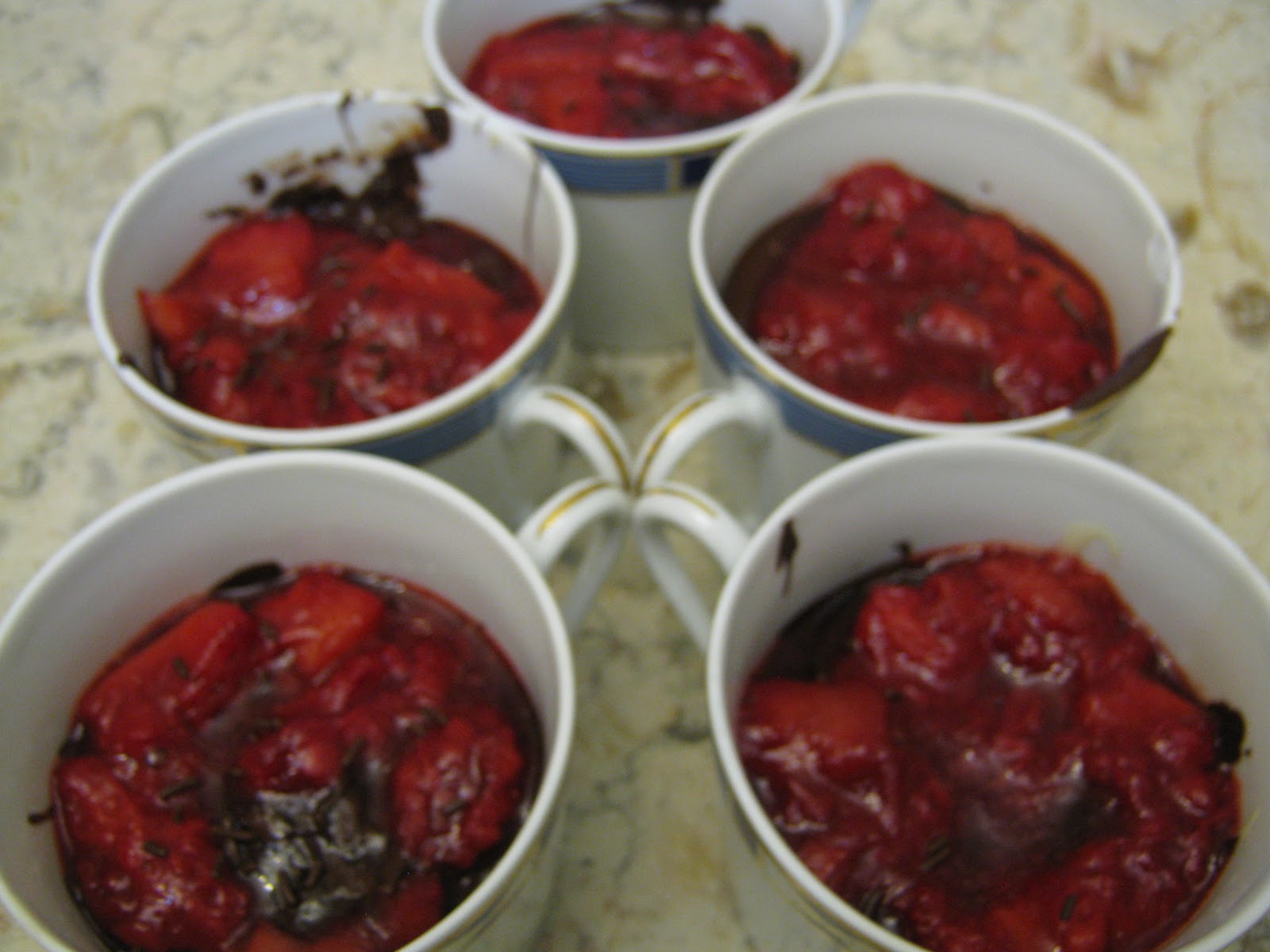 Levar o restante leite ao lume, juntamente com o açúcar e a casca de limão até levantar fervura. Juntar depois, aos poucos, o leite quente à mistura de maizena e levar tudo, de novo, ao lume até engrossar. Dispor o creme em tacinhas individuais e reservar. Levar o chocolate, partido em pedaços, a derreter ao microondas, de 30 em 30 segundos e ir mexendo entre cada aquecimento até que esteja derretido. Colocar uma colher de sobremesa de chocolate derretido sobre o creme de leite em cada tacinha e reservar. Arranjar os morangos e cortá-los em pedaços médios para um tachinho; polvilhar com açúcar mascavado a gosto e regar com um pouco de vinho do porto. Levar ao lume, mexendo de vez em quando, até os morangos ficarem quase reduzidos a compota e colocar uma colher desta mistura em cada tacinha do doce de leite com o chocolate derretido. Se desejar, polvilhar um pouco de granulado de chocolate em cada dose. Deixar arrefecer à temperatura ambiente não mais do que duas horas antes de servir (desde que terminei a receita até ao momento de servir decorreram cerca de 3 horas e o chocolate já tinha endurecido um pouco, por isso, o ideal será preparar a receita entre 1 a 2 horas antes de consumir).