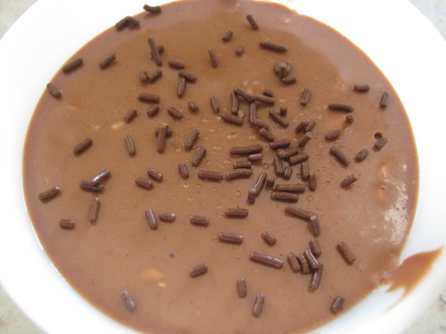Num tacho colocar todos os ingredientes (excepto a gelatina) e levar ao lume brando, mexendo sempre até ferver (preparem-se para uns bons 30 minutos). Demolhar a gelatina num pouco de água fria. Escorrer e juntar ao preparado anterior mexendo até que se tenha dissolvido. Colocar em potes ou tacinhas e deixar arrefecer antes de colocar no frio. Levar ao frigorifico, no mínimo, durante 5 horas (deixei de um dia para o outro). Conservam-se durante cerca de 8 dias (se durarem esse tempo). Antes de servir, se desejarem, podem enfeitar com um pouco de chocolate granulado.