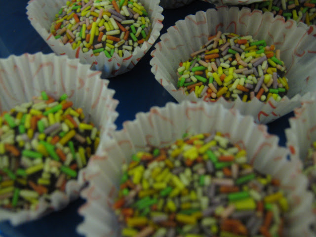 Ingredientes: (para cerca de 30 unidades) 1 lata de leite condensado magro; 5 c. (de sopa) de cacau em pó; 1 c. (de sopa) de manteiga sem sal; confeites coloridos; óleo q.b. Preparação: