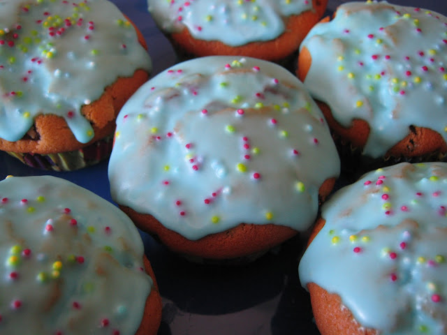 Cobrir os muffins com o glacé e polvilhar com confeites coloridos a gosto, deixando sobre a grelha durante a noite.
