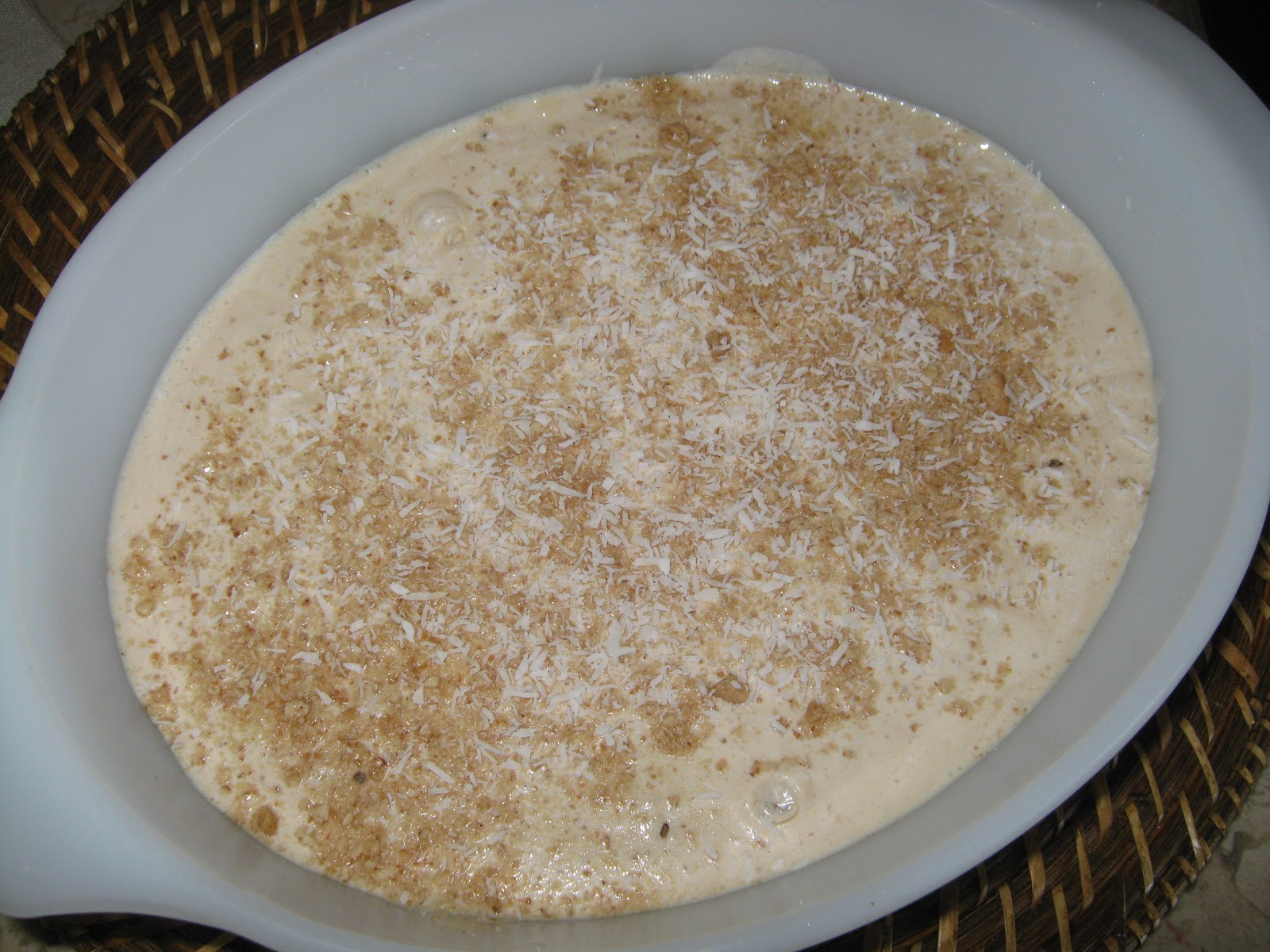 Levar ao frio até solidificar (o ideal é dum dia para o outro) e antes de servir, polvilhar com um pouco de bolacha moída e coco ralado a gosto.