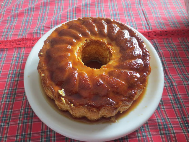 Depois há 2 opções: ou vai ao forno, a 180º, dentro de um tabuleiro com água, durante 45 minutos ou coze-se na panela de pressão (eu fiz na panela de pressão, com um bocadinho de água no fundo e com a forma sobre uma base de arame, daquelas que se usam para pousar os tachos.