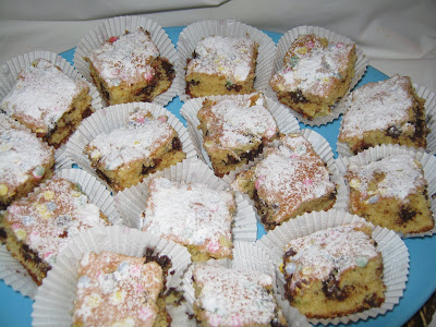 Unte um tabuleiro com margarina e verta para lá a massa, salpicando com os confeites coloridos e as pepitas de chocolate a gosto.