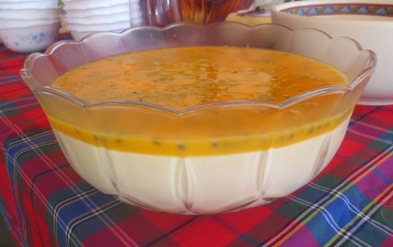 Misturar bem o leite condensado com o sumo de maracujá. Juntar a gelatina, demolhada e posteriormente dissolvida em meio decilitro de leite (2 colheres de sopa, mais ou menos). Juntar depois as natas batidas em chantilly, misturando bem. Vai ao frio por, pelo menos, 6 horas.