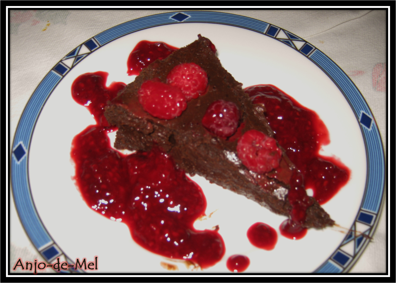 Ingredientes: tarte: 400g de chocolate negro (usei de culinária); 100g de chocolate de leite; 200g de manteiga sem sal; 6 ovos (à temperatura ambiente); 30g de açúcar amarelo; 1 c. (de sopa) de café (usei descafeinado); 1 pitada de sal. calda: 350g de framboesas congeladas (retirar algumas para a decoração final); 350g de mistura de frutos vermelhos congelados; sumo de meio limão (pequeno); 3 c. (de sopa) de açúcar baunilhado. Preparação: Pré-aquecer o forno a 210ºC. Untar uma forma de aro (com cerca de 24 cm de diâmetro e no mínimo 6cm de altura), forrar a base com papel vegetal untado e envolver toda a forma em duas folhas de alumínio e reservar. Colocar água quente no fundo de um tabuleiro de forno grande (para cozer a tarte em banho-maria). Derreter o chocolate com a manteiga em banho-maria, mexendo ocasionalmente (poderá aproveitar esta água para o banho-maria do forno). Retirar do lume e adicionar o café e o sal, misturando bem. Bater os ovos com a batedeira até se formar uma espuma. Adicionar aos poucos o açúcar e bater até triplicar de volume e se formar picos médios (cerca de 8 a 10 minutos). Envolver um quarto dos ovos na mistura de chocolate, até estarem incorporados. Juntar o resto dos ovos em quartos e envolver novamente para ficar tudo bem incorporado. Deitar a massa na forma e alisar a superfície com uma espátula. Colocar a forma dentro do tabuleiro de forno, cobrir com uma folha de alumínio untada e levar a cozer por 10 minutos. Retirar a folha de alumínio e deixar a cozer mais sete minutos. Retirar a tarte do forno (mesmo parecendo que não está bem cozida) e deixar arrefecer completamente dentro do tabuleiro. Cobrir com película aderente e levar ao frigorífico, no mínimo, três horas antes de servir. Para a calda de frutos vermelhos, levá-los num tachinho ao lume e quando começar a ferver, reduzir para lume brando e deixar entre 10 a 15 minutos, mexendo de vez em quando, até formar uma calda espessa. Desligar o lume e deixar a calda arrefecer. Antes de servir, adicionar o sumo de limão e o açúcar baunilhado, misturando bem. Tirar a tarte do frigorífico e passar com uma faca em redor, entre o bolo e a forma e depois retirar o aro, com cuidado, e transpor para um prato de servir. Decorar com as framboesas reservadas e servir em fatias com a calda de frutos a gosto.
